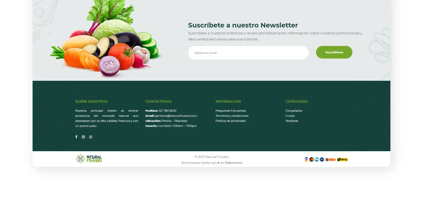 Después del desarrollo de su identidad de marca, Natural Fruvers necesitaba un canal digital que le permitiera comercializar sus productos de forma directa y organizada. El reto estaba en trasladar el lenguaje visual de la marca a una experiencia de compra clara, funcional y confiable.